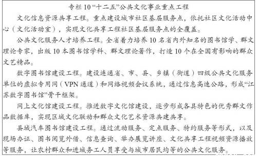 文化事业繁荣工程。加强社会主义核心价值体系教育,大力弘扬“三创”精神,提高全民文化素质。进一步向社会免费开放公共文化设施,推动城市公共文化服务向农村延伸,建设城乡社区文化中心,实施文化资源信息共享工程。进一步提高公共体育设施向社会开放程度,开展国民体质测试,打造城市社区“10分钟体育健身圈”。