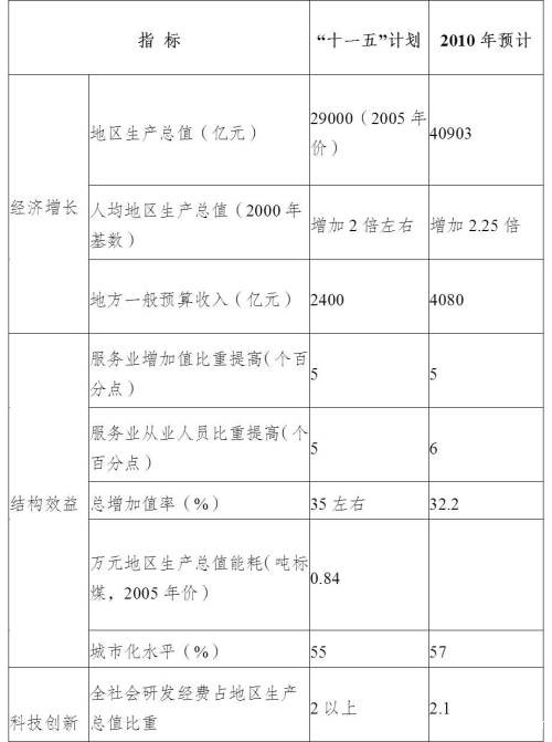 经济发展跃上新台阶。2010年,地区生产总值40903亿元,年均增长13.5%,人均地区生产总值超过5万元;财政总收入突破万亿元大关,其中地方一般预算收入4080亿元;全社会固定资产投资五年累计超过7.5万亿元;全社会研发经费占地区生产总值比重达到2%以上,区域创新能力居全国前列。