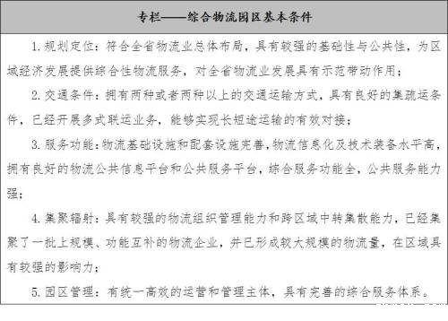 结合城市功能定位和产业布局,依托物流枢纽和中心城市,在加强资源整合的基础上,重点打造20个多种运输方式无缝衔接、长短途运输有效对接、物流组织化程度高、技术水平先进、集散能力突出、公共服务能力强,对物流业发展具有较强示范带动作用的综合物流园区。
