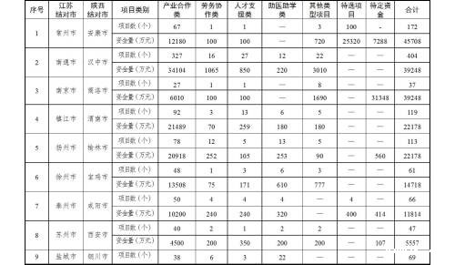 安排211763万元帮扶资金,用于陕西10个结对市的56个国家扶贫开发工作重点县(片区县),涉及具体项目1172个,其中:安康(常州)172个、汉中(南通)404个、商洛(南京)37个、渭南(镇江)119个、榆林(扬州)113个、宝鸡(徐州)61个、咸阳(泰州)66个、西安(苏州)47个、铜川(盐城)69个、延安(无锡)84个。