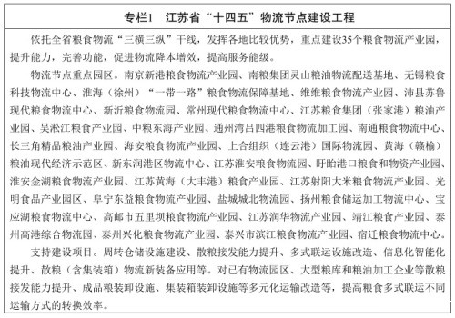 强化粮食物流通道能力。针对不同区域特点补齐设施短板,强化功能升级,加强通道衔接,增强东陇海线、淮河出海线、沿长江、沿海、沿京杭运河线、沿连申内河线“三横三纵”粮食物流通道能力。加强徐州(新沂、沛县)、连云港等粮食物流节点建设,推动东陇海线通道铁路粮食物流干线运输组织模式向班列化方式转变,提高新亚欧大陆桥铁路运输、铁海联运和国际粮食物流通行能力。加强南京、泰州、苏州、南通等散粮仓储与物流设施建设,重点提升沿长江通道粮食接卸、江海联运、分拨集散能力,提高服务长江经济带的粮食多式联运效率。加强淮安、宿迁等物流节点集散能力,提升沿淮河出海线内河散粮运输和成品粮集装箱运输功能。加快连云港、盐城(大丰港)、南通(通州湾)等港口铁路支线建设,提升沿海通道粮食专用码头、专业散粮设施、多式联运转运设施、通用集装箱装卸设施功能。加强扬州、常州、无锡等散粮仓储与物流节点建设,提升沿京杭运河线通道粮食接卸、水水中转和分拨集散能力。加强连云港、盐城、南通等多式联运物流节点与粮食产区对接,提升沿连申内河线铁水联运、河海联运等功能,发展铁水散粮运输和成品粮集装箱运输。