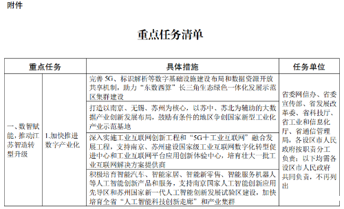 (一)加快推进数字产业化。完善5G、标识解析等数字基础设施建设布局和数据资源开放共享机制,助力“东数西算”长三角生态绿色一体化发展示范区集群建设。打造以南京、无锡、苏州为核心,以苏中、苏北为辅助的大数据产业创新发展布局,鼓励有条件的地区争创国家新型工业化产业示范基地。深入实施工业互联网创新工程和“5G+工业互联网”融合发展工程,支持南京、苏州建设国家级工业互联网数字化转型促进中心和工业互联网平台应用创新体验中心,培育壮大一批工业互联网解决方案提供商。积极培育智能汽车、智能家居、智能新零售、智能服务机器人等人工智能创新产品和服务,支持南京国家人工智能创新应用先导区和苏州国家新一代人工智能创新发展试验区建设,加快培育全省“人工智能科技创新走廊”和产业集群。(省委网信办、省委宣传部、省发展改革委、省科技厅、省工业和信息化厅、省通信管理局,各设区市人民政府按职责分工负责;以下均需各设区市人民政府共同负责,不再列出)