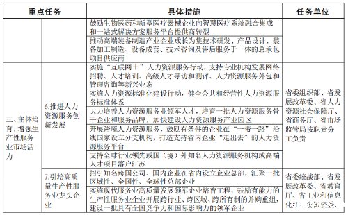 (一)推进人力资源服务创新发展。实施“互联网+”人力资源服务行动,支持专业机构发展网络招聘、人才培训、高级人才寻访和测评、人力资源服务外包和管理咨询等新兴业态。实施人力资源标准化建设行动,健全公共和经营性人力资源服务标准体系。大力培养人力资源服务业领军人才,培育一批人力资源服务骨干企业和服务品牌,加快建设人力资源服务产业园区。开展跨境人力资源服务,鼓励有条件的企业在“一带一路”沿线国家设立分支机构,打造支持省内企业“走出去”的人力资源服务平台。支持全球行业领先或国(境)外知名人力资源服务机构或高端人才项目落户江苏。(省委组织部、省发展改革委、省人力资源社会保障厅、省商务厅、省市场监管局按职责分工负责)