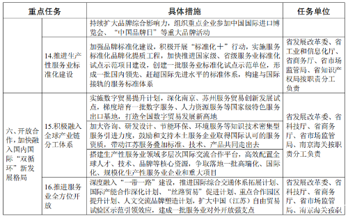 (一)积极融入全球产业链分工体系。实施数字贸易提升计划,深化南京、苏州服务贸易创新发展试点,梯度培育一批数字服务、人力资源服务等国家级特色服务出口基地,打造全国数字贸易发展新高地。加大咨询、研发设计、节能环保、环境服务等知识技术密集型服务引进力度,鼓励和支持本土服务企业取得国际认可的服务资质,带动江苏服务叠加标准、技术、产品共同走出去。搭建生产性服务业领域多层次国际交流合作平台,高效配置全球人才、技术、品牌等核心资源,争取落地一批高端化、国际化、规模化生产性服务业企业和重大项目。(省发展改革委、省科技厅、省商务厅、省市场监管局、南京海关按职责分工负责)