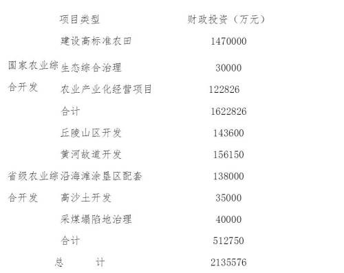 “十三五”期间,省级农业综合开发规划投入财政资金51.3亿元。其中,丘陵山区开发项目规划投入财政资金14.4亿元;黄河故道开发项目规划投入财政资金15.6亿元;高沙土开发项目规划投入财政资金3.5亿元;沿海滩涂垦区配套项目规划投入财政资金13.8亿元;采煤塌陷地治理项目规划投入财政资金4亿元。