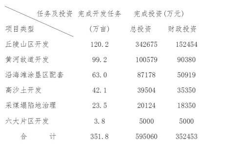 “十二五”期间,省级农业综合开发项目总投资59.5亿元,其中财政资金35.2亿元。改善农田基础设施351.8万亩,其中丘陵山区开发120.2万亩,黄河故道开发99.2万亩,沿海滩涂垦区配套63.0万亩,高沙土开发42.1万亩,采煤塌陷地治理23.5万亩,六大片区开发3.8万亩。