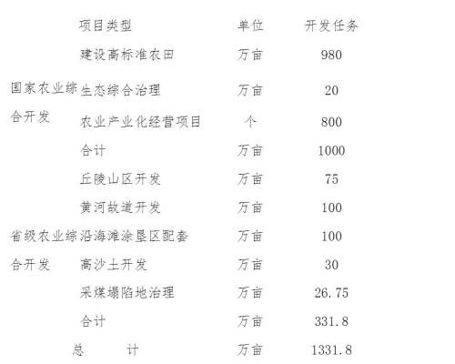 “十三五”时期,全省农业综合开发规划完成农田基础设施建设任务1331.8万亩,其中:建设高标准农田980万亩,生态综合治理20万亩,丘陵山区开发75万亩,黄河故道开发100万亩,高沙土开发30万亩,滩涂垦区配套100万亩,采煤塌陷地治理26.75万亩。扶持农业产业化经营项目800个左右。