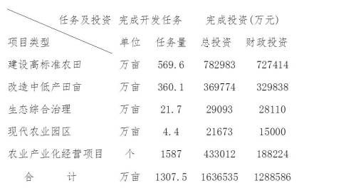 “十二五”期间,全省完成国家农业综合开发项目总投资163.7亿元,其中财政资金128.9亿元。建设高标准农田569.6万亩、改造中低产田360.1万亩、生态综合治理21.7万亩、建设现代农业园区4.4万亩;扶持农业产业化经营项目1587个。
