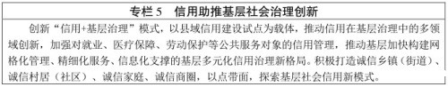 发挥社会信用体系助力基层社会治理创新作用,将信用管理融入基层网格化治理体系,构建基于居民信用的社区治理新模式,形成基层社会治理新格局,有效提高基层治理的效率和精准度。以守信激励为主,创新应用场景,引导居民向上向善、重义守信。加快农村信用体系建设,推动信用体系建设和乡村振兴有效结合,焕发乡村文明新气象。发展农村信用大数据,建设“三农”信用信息系统,建立家庭农场、农民合作社、涉农企业信用记录,加强信用监管,全面提升农民诚信意识。