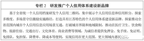 信用服务体系逐步完善。着力培育信用服务市场,省级安排1858万元专项资金用于购买第三方信用服务,促进信用服务市场稳步发展。建设江苏省信用服务机构管理系统,引导398家信用服务机构自主申报信息。6家企业征信机构取得中国人民银行备案。提升企业信用管理能力,对2.25万家企业开展公益性信用管理培训,创建2420家市级信用管理示范企业和214家省级信用管理示范企业。南京、徐州、淮安、盐城、连云港和宿迁等市在招标投标、政府采购等工作中大力推行第三方信用报告。全省信用服务机构累计为各类市场主体出具信用报告4.6万份。